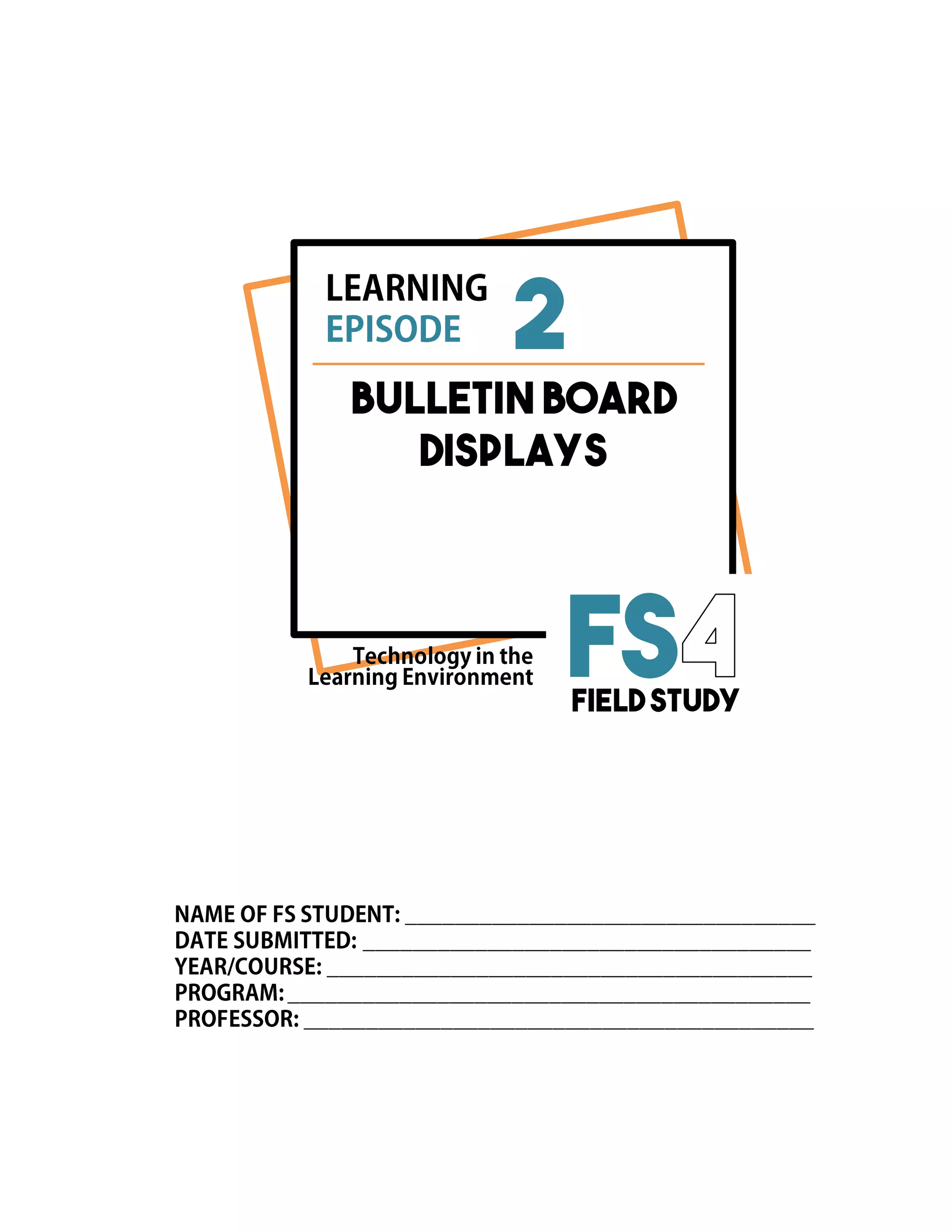 The document provides instructions and forms for students to observe and evaluate bulletin board displays in a school. Students are asked to document their observations of board displays, including location, content, design, and materials used. They then evaluate one display in more detail using a rating form addressing criteria like effective communication, attractiveness, and correctness. Finally, students reflect on skills needed to create good displays and how to improve the evaluated display.