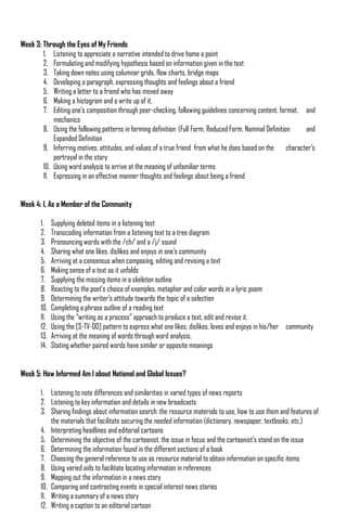 The document outlines a comprehensive English lesson plan for a resource teacher at Candating High School, detailing weekly themes that include self-perception, family views, and community engagement. Each week incorporates various activities aimed at enhancing listening, speaking, reading, and writing skills, while also aligning with broader educational objectives. The curriculum demonstrates vertical and horizontal articulation, emphasizing a progressive development in language skills and integration with other subjects.