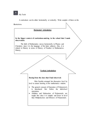 The document discusses different curriculum design models including learner-centered, subject-centered, and problem-centered models. It provides examples of horizontal and vertical articulation in curriculum. The student expresses a preference for learner-centered models and analyzes aspects of the basic education curriculum that could be modified. Specifically, the student notes the curriculum was congested previously and caused learning hindrances. The student also reflects on strengths of different models and creates an illustration of the learner-centered model incorporating its salient features.