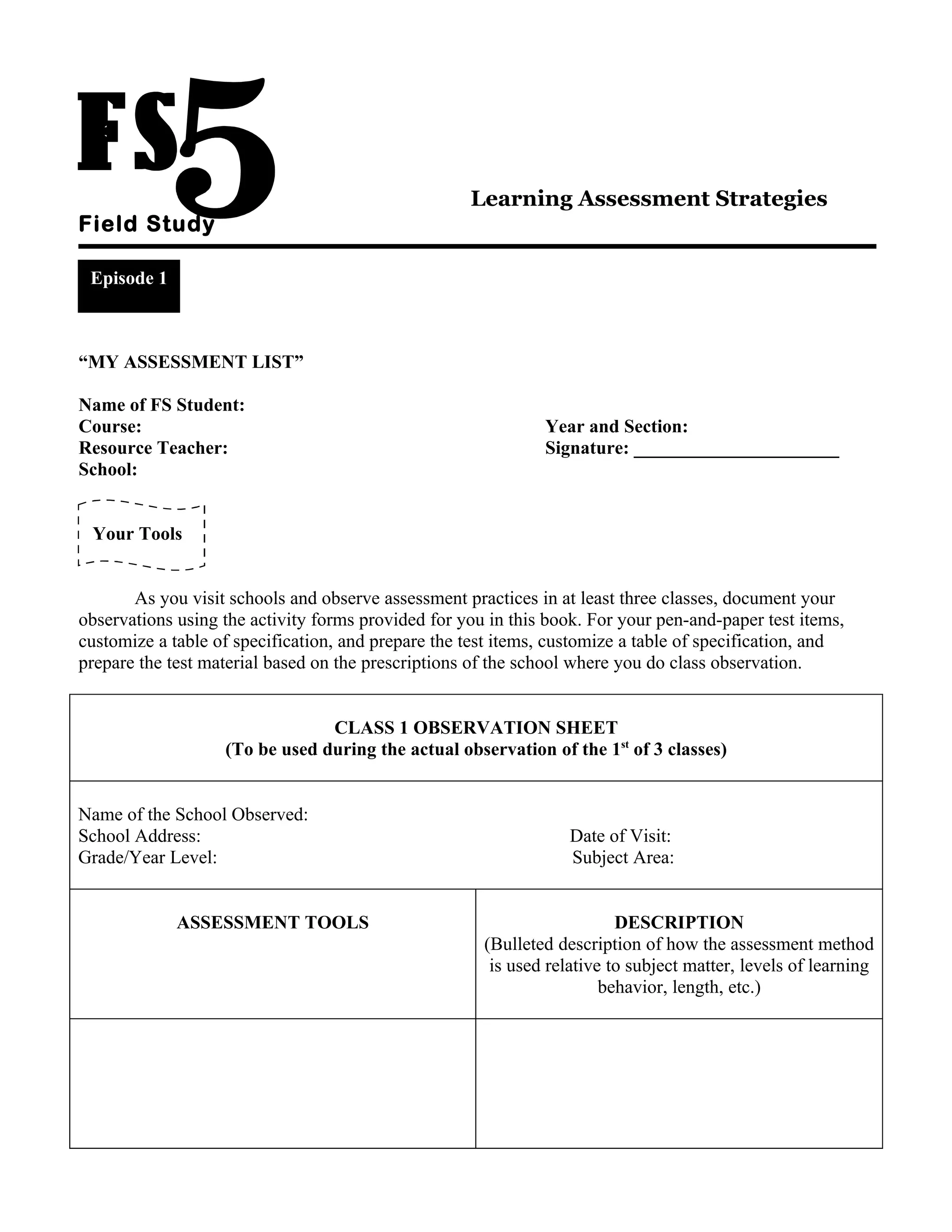 The document provides guidance for students on conducting field studies to observe classroom assessment practices. It instructs students to document their observations of various assessment methods used in three different classes. Students are then asked to design their own assessment tools, including a pen-and-paper test based on the objectives of the observed class. The document outlines steps for developing assessment plans, including conducting interviews with teachers and designing both process-oriented and product-oriented performance assessments. The overall goal is for students to gain experience with different assessment strategies through observation and hands-on practice.