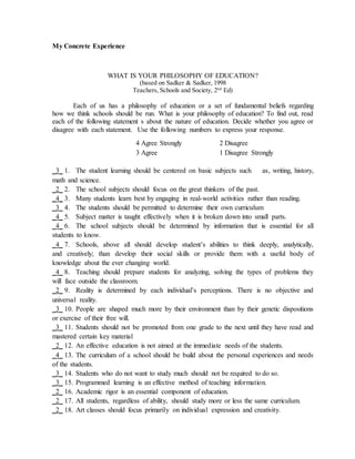 The document outlines a student's philosophy of education, assessing their beliefs and values regarding teaching and learning principles. It discusses various educational philosophies and the student's reflections on the impact of these beliefs on their future teaching career. The student emphasizes the importance of recognizing individual learning styles and creating a supportive and inclusive learning environment.