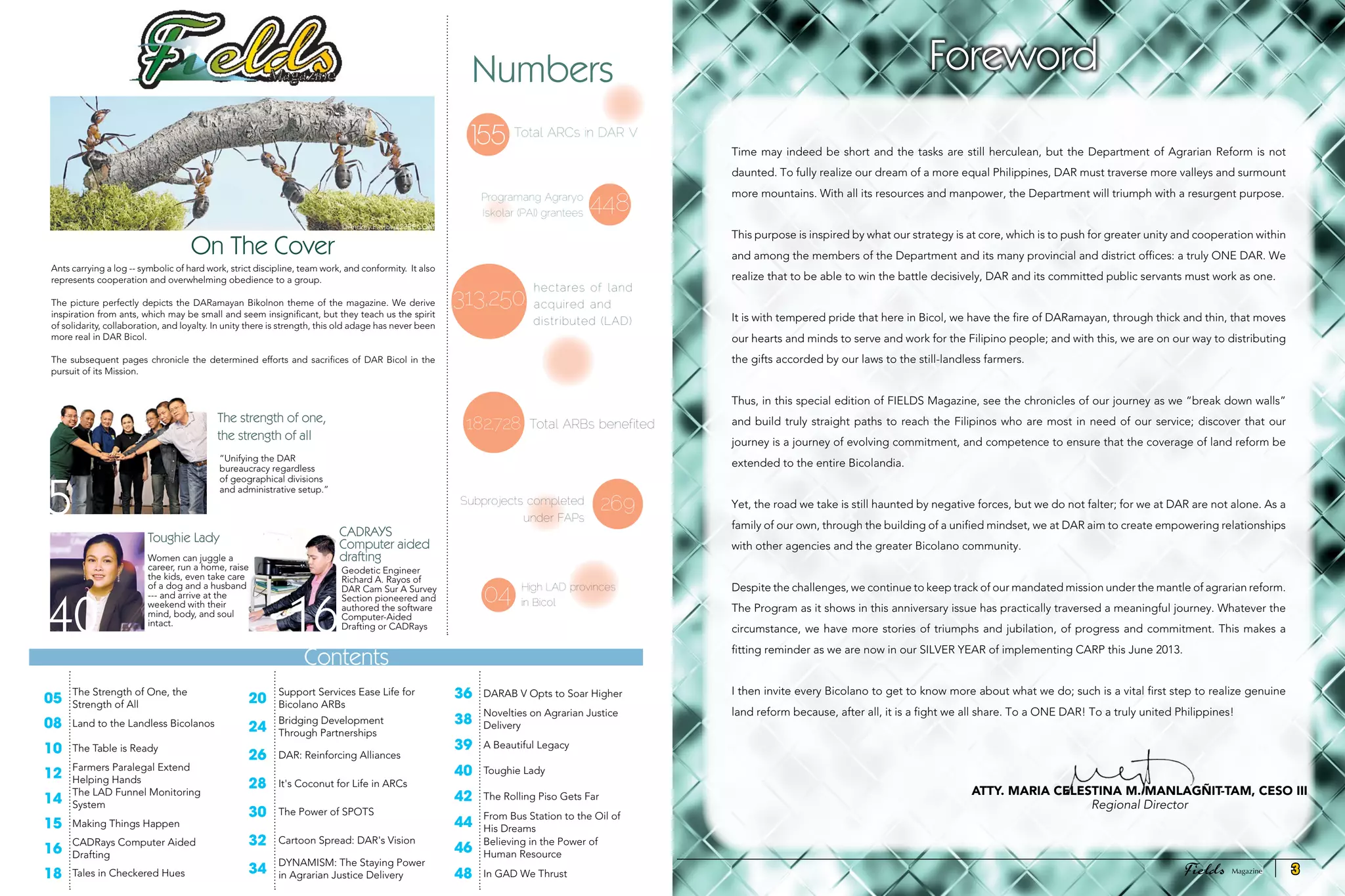 This document summarizes the implementation of the One DAR concept in the Bicol region to more efficiently achieve the goals of agrarian reform. It discusses how the regional director has reassigned personnel and adjusted project coverage across provincial boundaries to encourage cooperation and maximize resources. The aim is to distribute land more quickly before the 2014 deadline to complete the Comprehensive Agrarian Reform Program. By breaking down barriers and embracing a unified approach, Bicol hopes to set an example for fulfilling agrarian reform's mandate of distributing land to farmers.