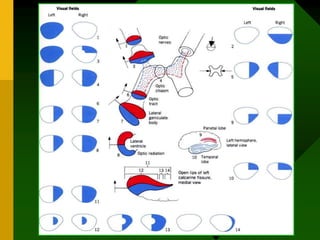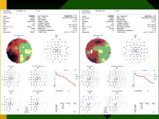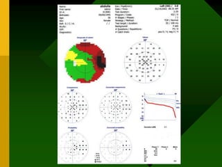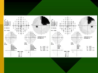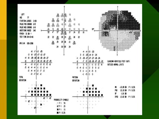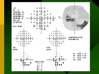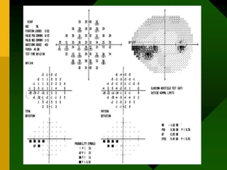The document discusses the visual field and perimetry. It defines the visual field as the area perceived simultaneously by a fixating eye. The visual field can be depicted as an "island of vision" surrounded by darkness. Normal visual field limits are described. Kinetic and static perimetry techniques are summarized. Common glaucomatous visual field defects like diffuse depression, localized nerve fiber bundle defects, arcuate scotomas, and nasal step defects are outlined. The history and types of perimetry instruments like Goldmann and automated perimeters are summarized briefly.