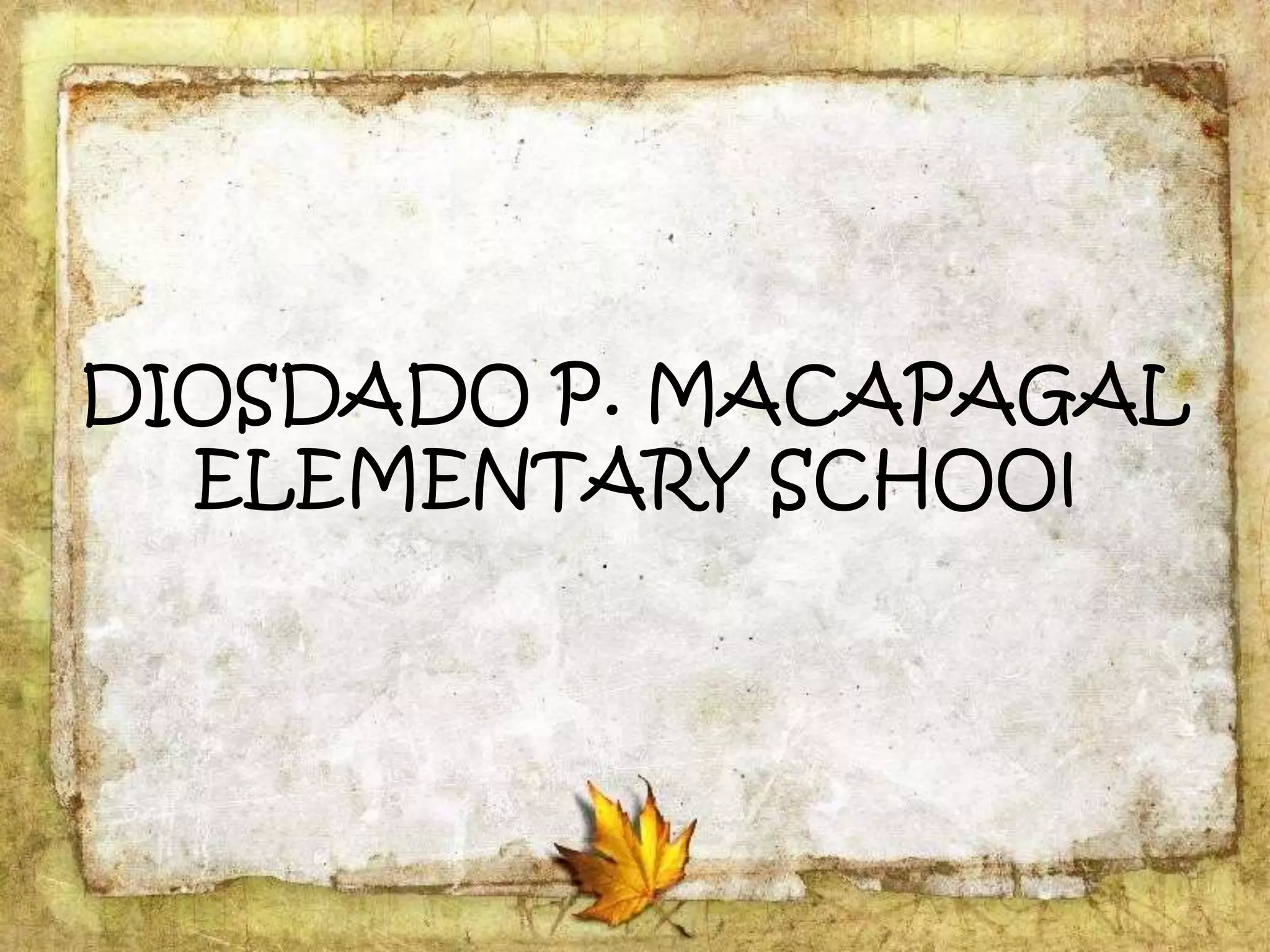 The document describes the organization and curriculum of the Diosdado P. Macapagal Elementary School. It outlines the school's administration structure, including the principal, teachers for different subjects, and other staff. It also discusses the school's curriculum approach, including the written, taught, supported, assessed, and learned curricula. Finally, it examines dimensions of curriculum design like basic concepts, articulation between grades, scope, sequence, integration and continuity.