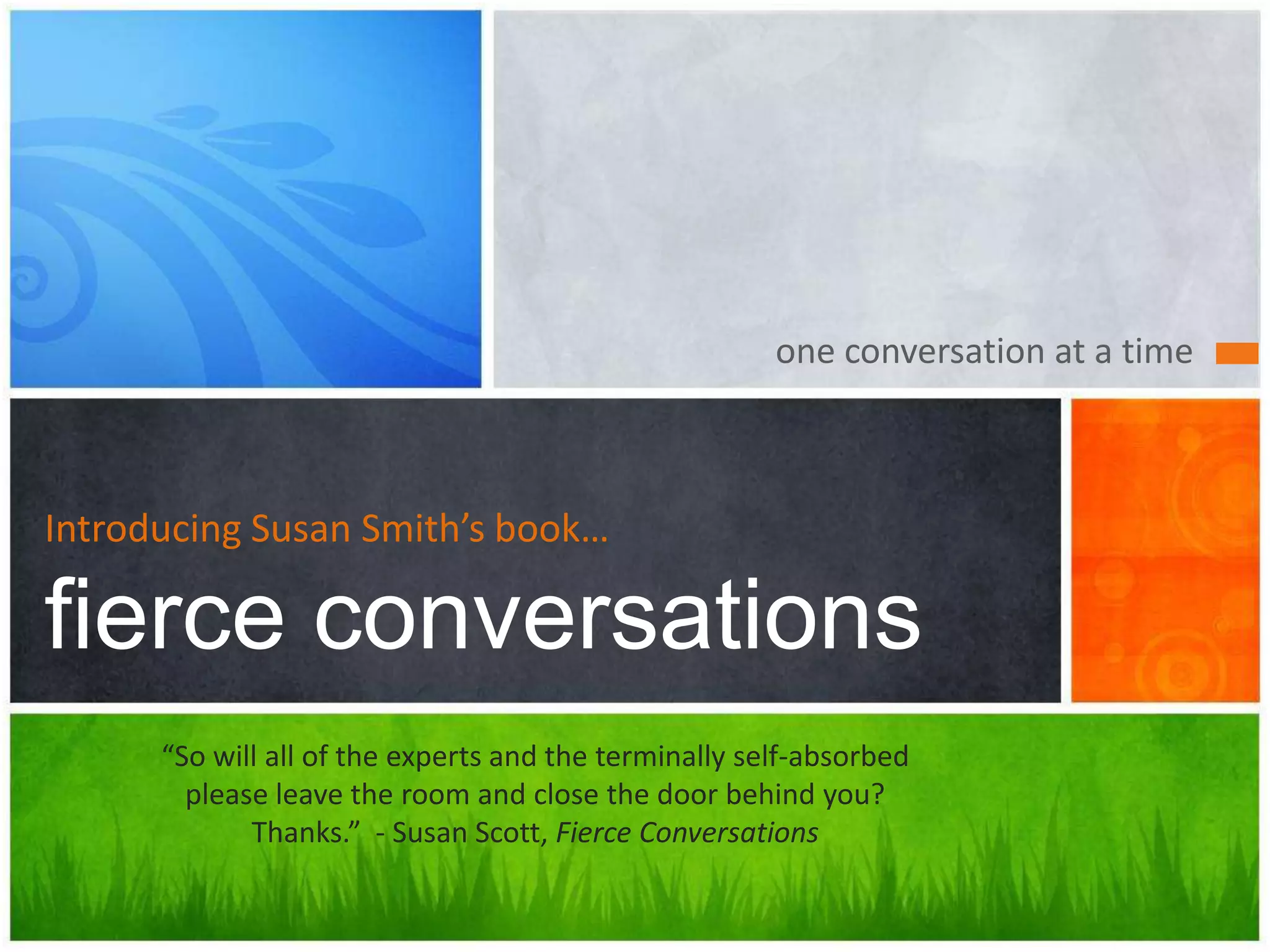 This document discusses Susan Scott's book "Fierce Conversations" and its key ideas. The book promotes having meaningful one-on-one conversations to build personal and professional success. It outlines seven principles for such conversations, including coming out from behind yourself, being fully present, letting silence do the heavy lifting, and taking responsibility for your emotional influence on others. It also describes different types of conversations like confrontations and provides a model for conducting confrontations respectfully by clarifying the issue, listening to different perspectives, and agreeing on resolutions.