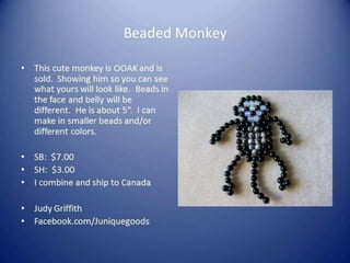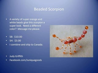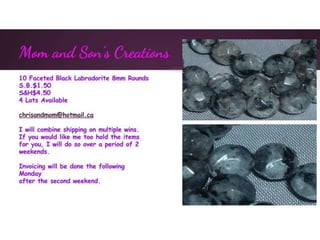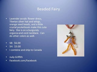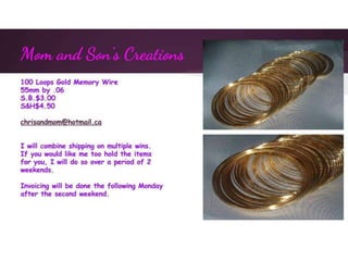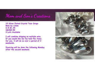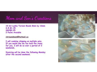 This document contains multiple listings from various sellers advertising beads, jewelry, charms, and other craft supplies. The listings include photos or descriptions of the items, starting bids, prices, and contact information for the sellers. Many of the sellers state that they combine shipping for multiple purchases. The items range from strands of beads, pendants, bracelets, earrings, charms, and other accessories. The document appears to be from an online marketplace where various artisans and crafters can list handmade or vintage items for sale.