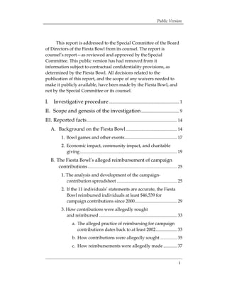 The Special Committee retained counsel to investigate the Fiesta Bowl. Counsel interviewed witnesses, reviewed documents, and analyzed expense records. The investigative procedure included reviewing over 55GB of electronic data and thousands of pages of materials. Counsel cited supporting materials from various sources using a prefix system. Counsel also conducted interviews of current and former Fiesta Bowl employees and board members over four months to inform its investigation.