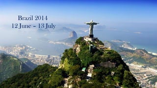 The document outlines information about the FIFA World Cup 2014 in Brazil, noting it as the 20th event and featuring innovations like goal-line technology. It details the official logo, mascot named 'Fuleco', the official match ball 'Adidas Brazuca', and the 32 qualified teams. Additionally, the document lists participating venues and stadiums, along with the matches scheduled between June 12 and July 13, 2014.