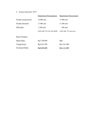 Dokumen ini menyajikan laporan biaya produksi untuk bulan September 2018 di PT Duta Harapan, yang mencakup dua departemen: pencampuran dan penyelesaian. Terdapat rincian mengenai produk dalam proses, biaya produksi, dan perhitungan pertanggungjawaban biaya untuk masing-masing departemen. Total biaya yang dibebankan adalah Rp 19.907.690,00.