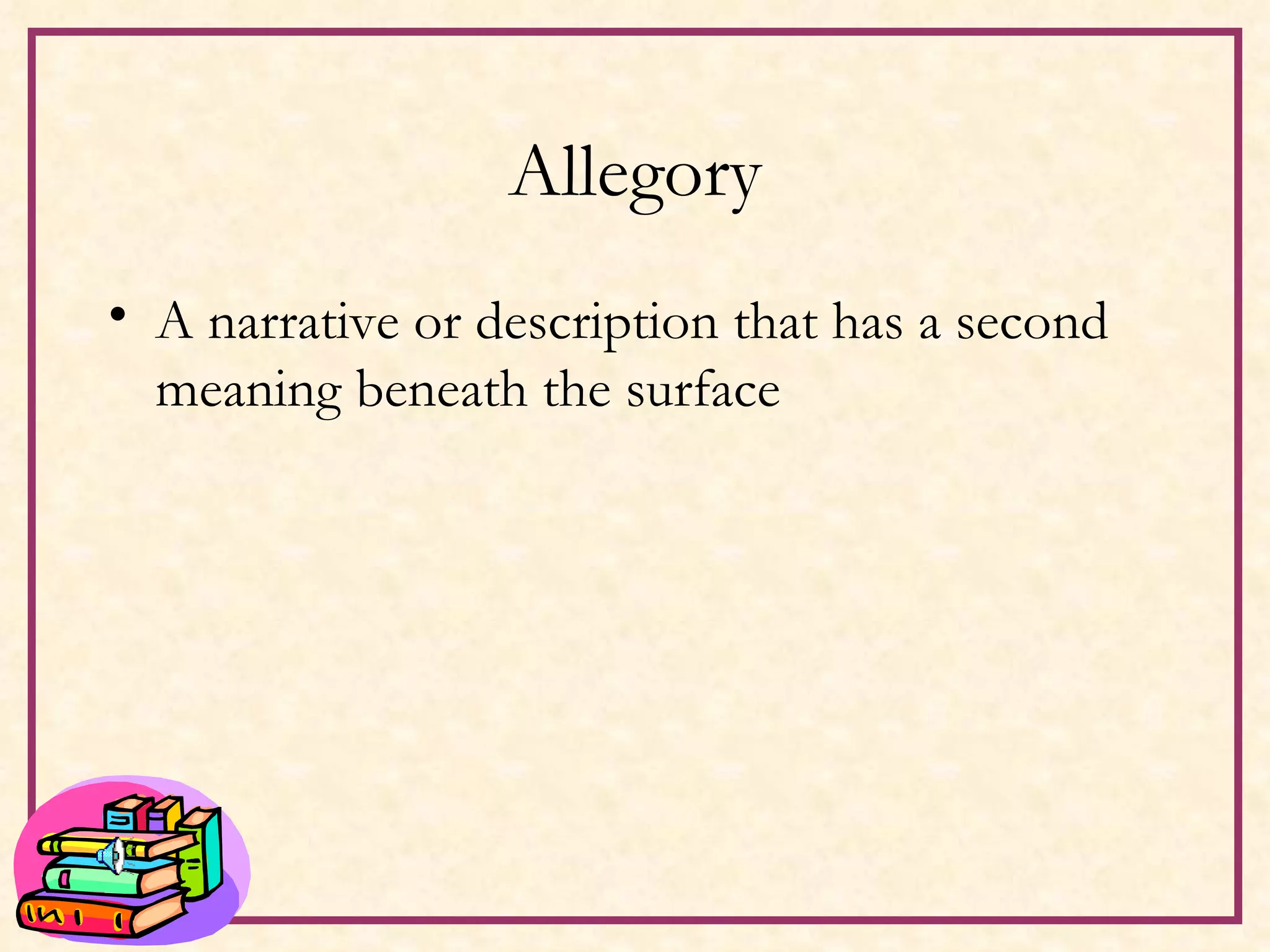 An allegory is a narrative that uses symbols to represent ideas and qualities in order to convey a hidden or ulterior meaning. Unlike a metaphor which is a single symbolic comparison, an allegory develops a more complex system of symbolic relationships. Two common examples of allegories given are Pilgrim's Progress, which uses elements to represent the Christian journey through life, and Animal Farm, which symbolizes aspects of the Russian Revolution. The document then provides examples of paradox, hyperbole, and understatement as other literary devices.