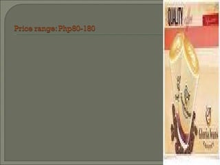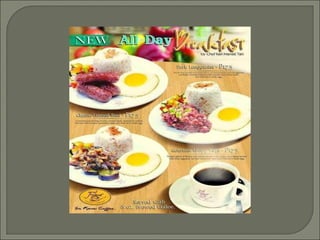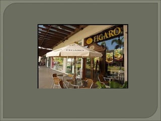 The document summarizes observations from visits to four Figaro Coffee Company locations on different dates in April 2011. It describes the number and demographics of customers observed, the drinks and foods purchased, location details within each mall or commercial area, and amenities available at each establishment such as comfort rooms, WiFi, and smoking areas. Key details on prices and specific drinks purchased are also provided for each location.