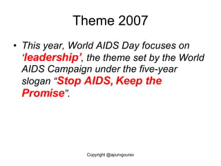 World AIDS Day 2007 focuses on 'leadership' under the theme 'Stop AIDS, Keep the Promise,' highlighting that 33 million people live with HIV/AIDS, with a significant proportion unaware of their status. The document emphasizes that HIV/AIDS is not only a health crisis but also a development issue, particularly impacting economies and society in developing countries. It calls for action, encouraging individuals to educate themselves and others about HIV/AIDS, respect those infected, and get involved in combating this epidemic.