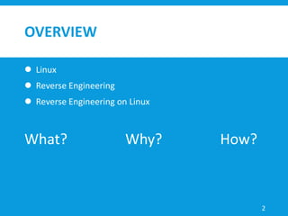 This document provides an overview of Linux and reverse engineering on Linux. It discusses what Linux is, how it was developed based on UNIX, and some popular Linux distributions. It also covers why Linux is useful, specifically mentioning its power, stability, and free licensing. The document then discusses setting up a virtual machine for safely conducting reverse engineering. It outlines basic Linux commands and concepts like files, permissions, and processes. Finally, it defines reverse engineering and covers approaches like static analysis, dynamic analysis, and common software vulnerabilities that can be exploited or protected against.