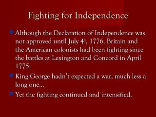 The document summarizes key events in the American fight for independence from 1775 to 1778. It describes early battles between American colonists and British troops, including Lexington and Concord, Bunker Hill, and the Siege of Boston. It also discusses the British leaving Boston in 1776, key American victories at Trenton, Princeton, and Saratoga in 1777, and France formally entering the war as an American ally in 1778 after the Continental Congress declared independence. The victories helped boost American morale and marked important turning points that weakened the British hold on the colonies.