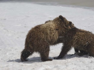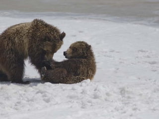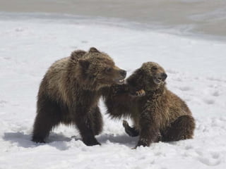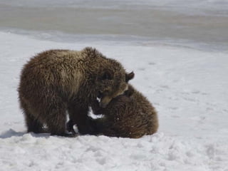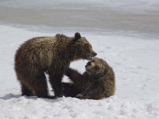 Two year old grizzly bear cubs wrestle in Grand Teton National Park.