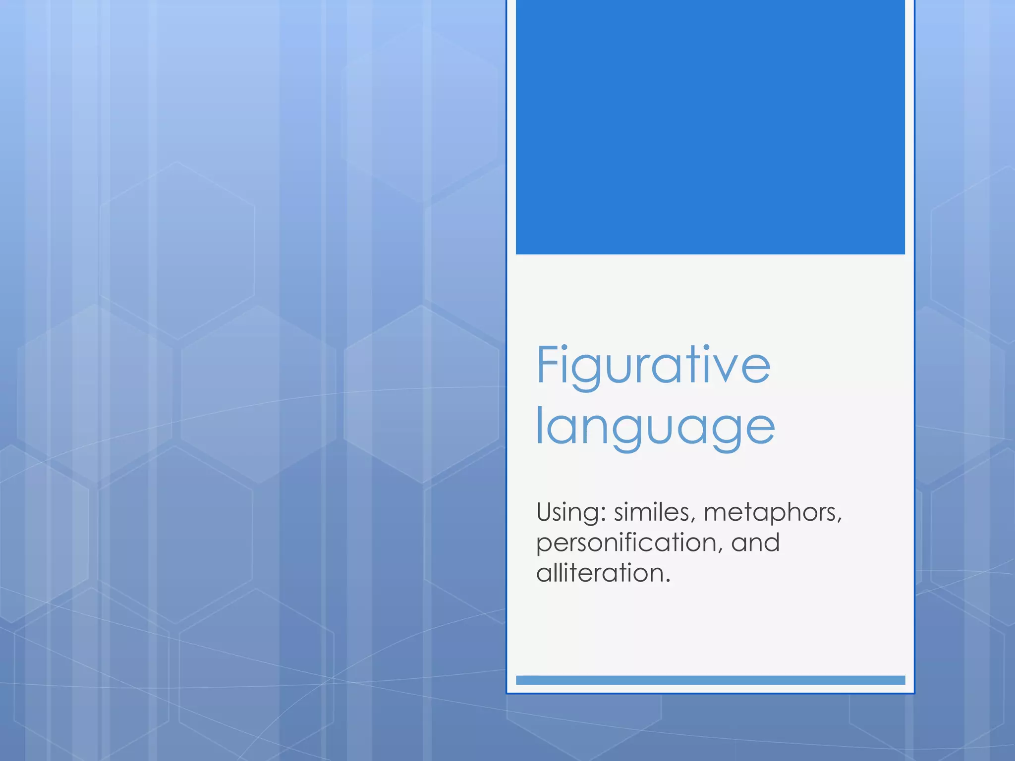 This document defines and provides examples of four types of figurative language: similes, metaphors, personification, and alliteration. Similes use like or as to compare two unlike things, metaphors make comparisons without using like or as, personification gives human traits to non-living objects or ideas, and alliteration repeats initial sounds in words for effect. Examples of each technique are given.