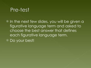 The document provides instructions for a quiz on identifying different types of figurative language. It lists several figurative language terms and their definitions. It then provides examples of sentences using different figurative language techniques and asks the reader to identify which technique is being used in each example sentence.