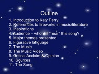 This document provides an outline for an oral presentation about the song "Firework" by Katy Perry. It discusses Perry's background and influences, references to fireworks in other works, the intended audience for the song, major themes around human growth and connection, and figurative language in the lyrics. The presentation also analyzes the music, music video, critical reception, and sources used.