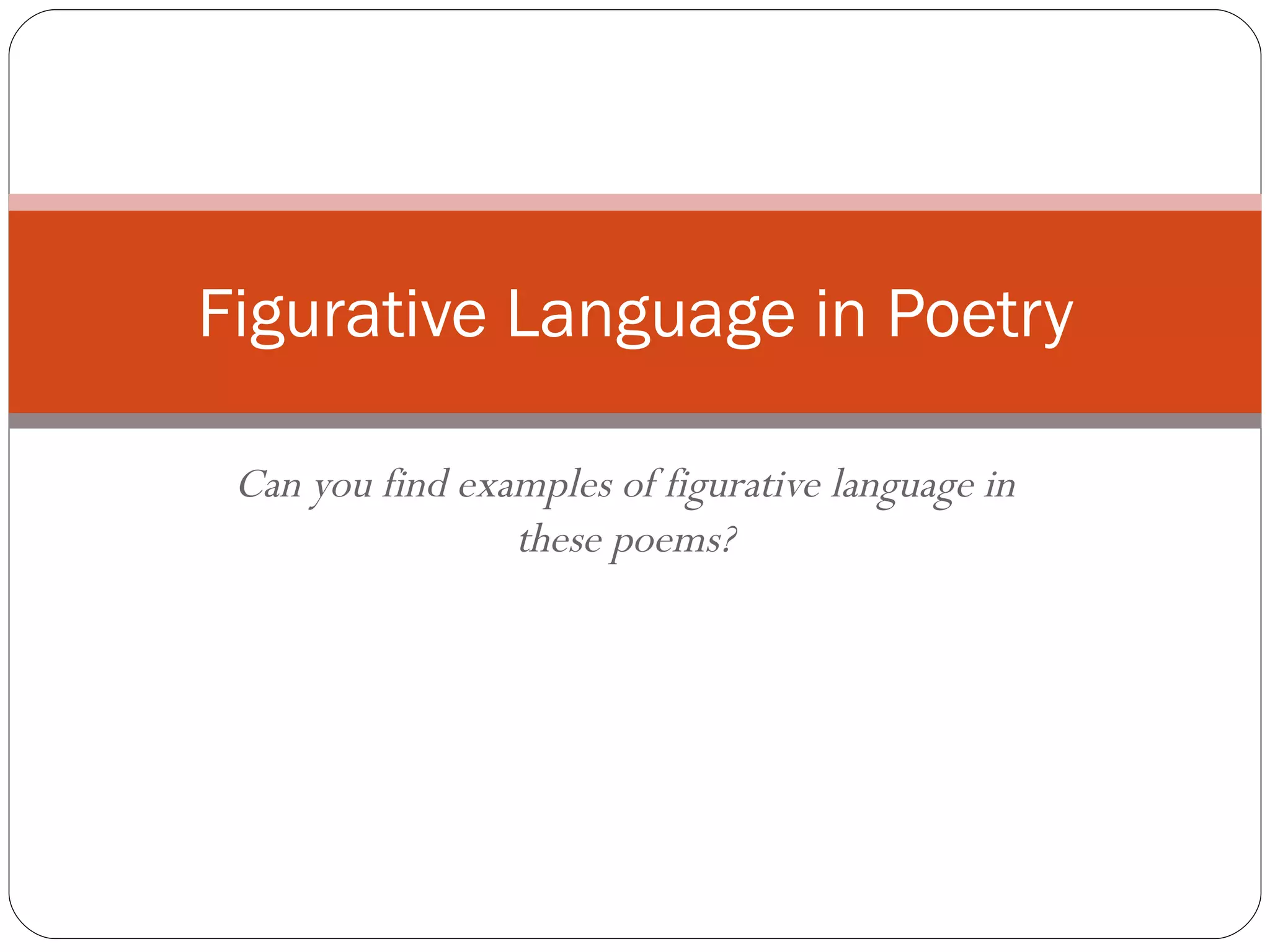 The document discusses examples of figurative language in four poems. The first poem, "Table Manners" by Gelett Burgess, uses figurative language like "gug and gumble" to describe rude eating habits. The second poem, the lullaby "Sleep, Baby, Sleep" uses nature imagery like "large stars are the sheep" and "gentle moon's the shepherdess." The third poem, an anonymous limerick, uses figurative comparisons like "her hair was like silk" and "her skin smooth as milk." The final poem, "The Ram" by an unknown author, exaggerates the size of the ram with phrases like "stood ‘bout ten yards high