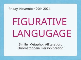 The document explains figurative language as a method of comparing things for emphasis and impact, highlighting its role in making writing more engaging. It defines various types, including simile, metaphor, personification, alliteration, and onomatopoeia, and provides examples for each. Additionally, it prompts readers to consider the importance of using figurative language in their writing.