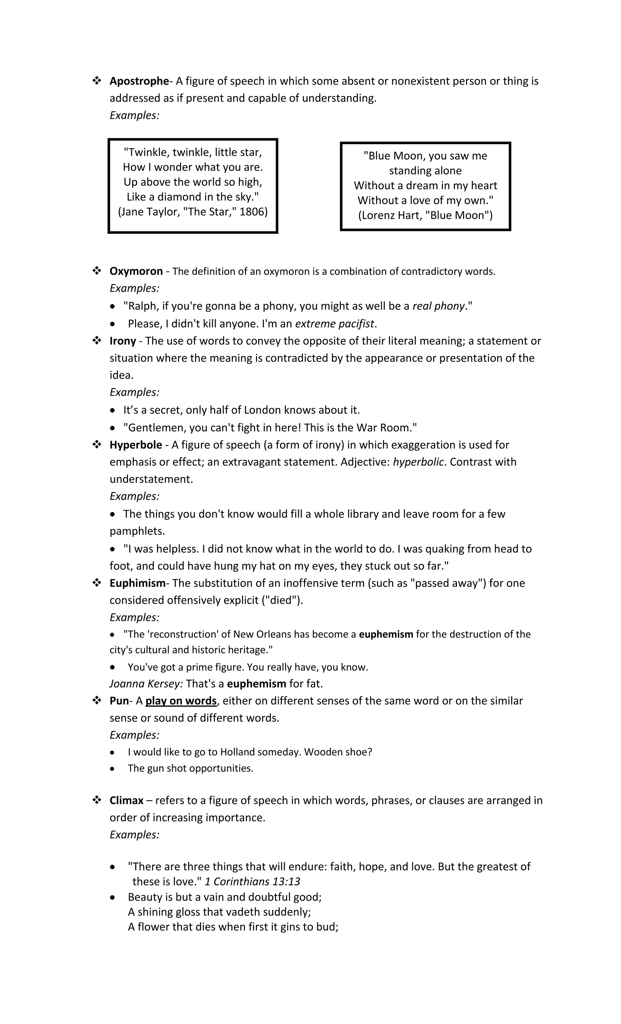 This document provides definitions and examples of various figures of speech that can be used in writing to engage readers. It lists similes, metaphors, personification, onomatopoeia, metonymy, synecdoche, antonomasia, apostrophe, oxymoron, irony, hyperbole, euphemism, puns, climax, and anaphora. The document warns that while these devices can make writing more lively, overusing them can become tiresome for readers. Moderation is key to effectively employing figurative language.