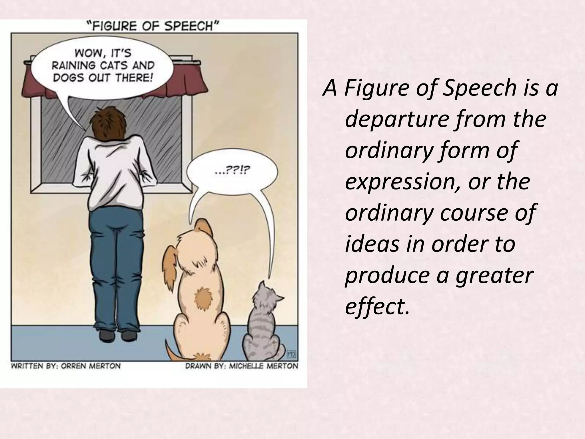 This document discusses various figures of speech including simile, metaphor, personification, hyperbole, irony and others. It provides definitions and examples for each figure of speech. Some key figures discussed are simile (a comparison using like or as), metaphor (an implied simile that takes the comparison for granted), personification (giving human traits to non-human things), hyperbole (overstatement for emphasis), and irony (saying something but meaning the opposite).