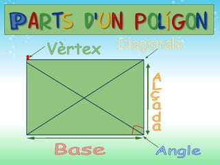 Els Polígonssón figures geomètriques formades per uns elements bàsics: els costats , els vèrtex i els angles . Els Polígons es classifiquen en: · Triangles : Equilàter, Isòsceles i Escalé. · Quadrilàters : Quadrat, rectangle, rombe, romboide, trapezi i trapezoide. · Polígons regulars : tots els costats tenen la mateixa longitud i tots els angles són de la mateixa mesura.
