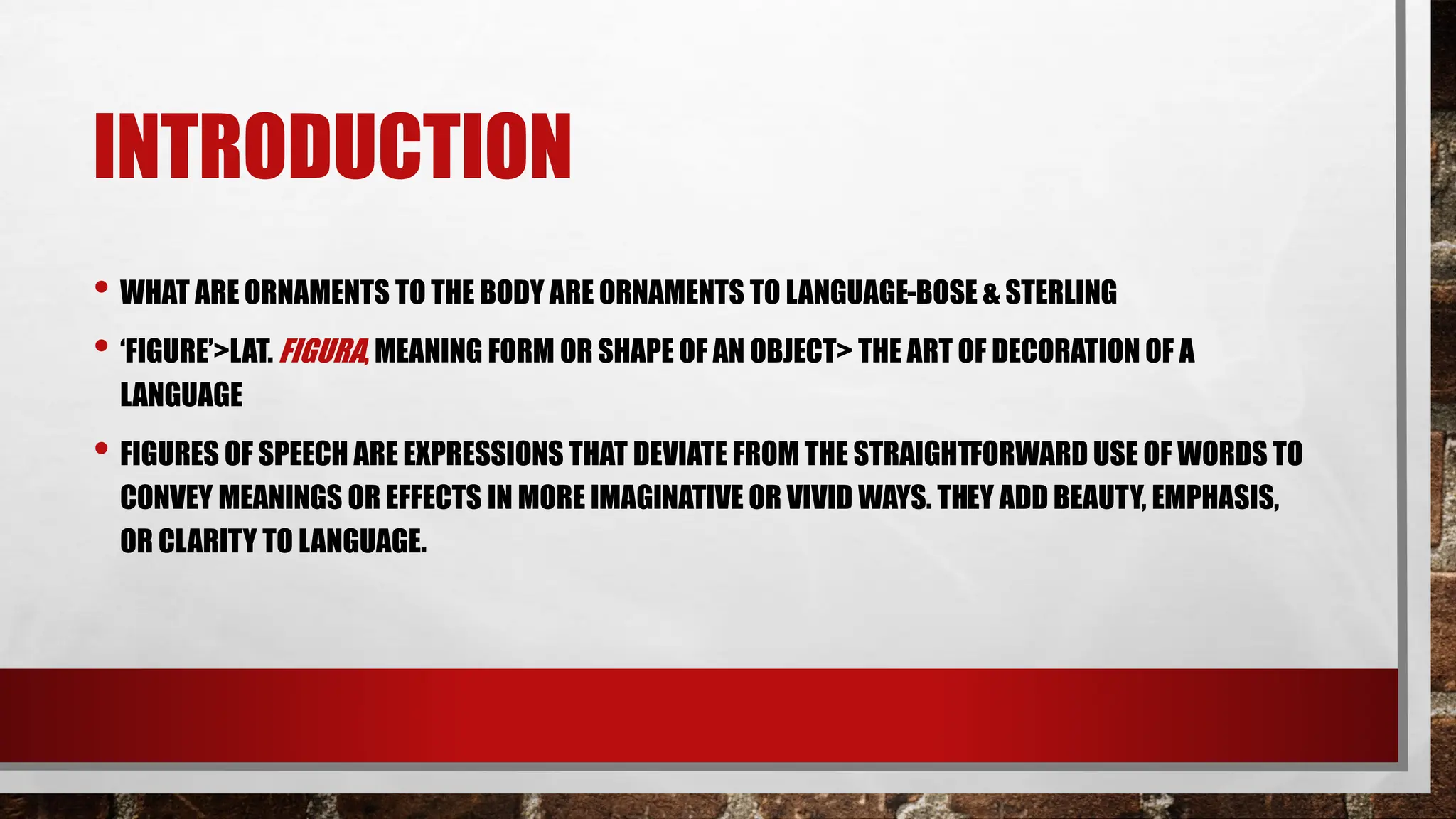 The document explores various figures of speech that enhance language by deviating from straightforward word usage to convey meaning more vividly. It categorizes these figures into comparisons, associations, contrasts, imagination, indirectness, sound, and construction, with each category encompassing specific types such as simile, metaphor, personification, irony, and others. Overall, it emphasizes the importance of these figures in enriching communication and making language more expressive.