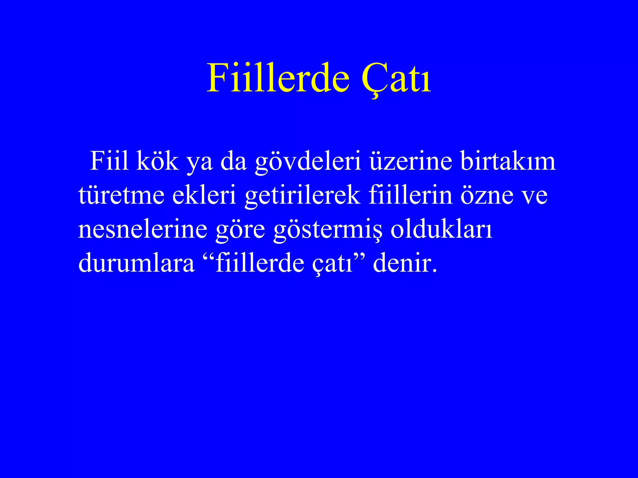 Fiillerde Çatı Fiilkök ya da gövdeleri üzerine birtakım türetme ekleri getirilerek fiillerin özne ve nesnelerine göre göstermiş oldukları durumlara “fiillerde çatı” denir.