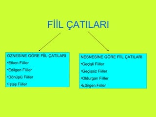 2. Edilgen Fiiller: Cümle okunduğunda veya dinlendiğinde, işin kimin tarafından yapıldığı belli olmuyorsa, yani cümlede “ sözde özne” varsa böyle fiillere edilgen fiiller denir. Edilgen fiiller, etken fiillerin sonuna –l, -n ekleri getirilerek yapılır. Kır-(ı)- l - / sev-(i)- n - Ali pencereyi kırdı . Pencere kırıldı . G.Özne Etken Sözde Özne Edilgen