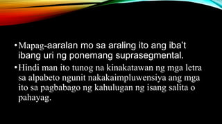 Ang dokumento ay tungkol sa ponemang suprasegmental na kinabibilangan ng antala, hinto, diin, haba, at tono na mahalaga sa tamang pagbigkas ng mga salita at pahayag. Tinutukoy nito ang iba’t ibang uri ng bigkas sa Filipino at kung paano ang mga pagbabago sa diin at tono ay nakakaapekto sa kahulugan ng salita. Nagbibigay ito ng mga halimbawa upang mas maipaliwanag ang mga konsepto.