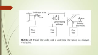 Filament winding is a manufacturing technique used to create cylindrical structures like pressure vessels by tension-winding fiber strands around a rotating mandrel. The process can utilize materials such as glass, carbon, and various resins, with parameters affecting fiber tension, wet-out, and material properties. While it offers advantages like high reproducibility and fiber orientation, disadvantages include potential defects and challenges in mandrel extraction.