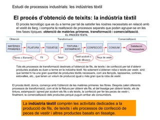 Estudi de processosindustrials: les indústries tèxtil El procés d’obtenció de teixits: la indústria tèxtil El procés tecnològic que es du a terme per tal de satisfer les nostres necessitats en relació amb el vestit és llarg, i comporta la realització de processos separats que poden agrupar-se en les tres fases típiques: obtenció de matèries primeres , transformació i comercialització . El procés tèxtil, doncs, comença amb l’obtenció de les matèries primeres: les fibres. Després calen diferents processos de transformació, com el de la filatura per obtenir els fils, el del tissatge per obtenir teixits, els de tintura, estampació i aprest per acolorir els fils o els teixits, la confecció per fer les peces de vestir i, finalment, la comercialització dels productes perquè puguin arribar als consumidors. Tots els processos de transformació destinats a l’obtenció de fils, de teixits i de confecció per tal d’obtenir productes acabats es duen a terme en la indústria tèxtil. No solament s’obtenen roba o teixits per vestir, sinó que també hi ha una gran quantitat de productes tèxtils necessaris, com ara llençols, tapisseries, cortines, estovalles, etc., que tenen un volum de producció igual o més gran que la roba de vestir. La indústria tèxtil comprèn les activitats dedicades a la producció de fils, de teixits i els processos de confecció de peces de vestir i altres productes basats en tissatge.