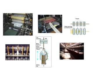 Estudi de processosindustrials: les indústries tèxtil i alimentària Primeres matèries tèxtils: el procés de filatura Tot i que cada fibra en particular necessita un procés de filatura específic, podem dir que la filatura consta de les operacions següents: Torçar o cargolar Dóna consistència i cohesió pentinat Una vegada es tenen les fibres netes i de forma esponjosa, cal pentinar-les a fi i a efecte de paral·lelitzar-les, és a dir, que quedin paral·leles les unes amb les altres. Aquesta operació la realitza una màquina anomenada la carda , que conté una sèrie de corrons amb tot de pues a la seva perifèria que en girar actuen com pintes. De la carda en surt el que s’anomena cinta de carda . neteja Les fibres d’origen vegetal o animal, com el cotó o la llana, solen arribar a la filatura en forma de bales , que són una mena de farcells on hi ha totes les fibres premudes. Llavors cal obrir les bales per extreure’n les fibres i netejar-les, ja que contenen restes vegetals, com ara fulles, pols, sorra, etc. La màquina encarregada de dur a terme aquesta operació és el batà obridor . El resultat és la napa , una mena de tela gruixuda i esponjosa que és recollida en bobines. L’estirat L’estirat es du a terme, generalment, en una màquina anomenada el manuar . Al manuar, diverses cintes de carda s’estiren i s’ajunten (doblen) per formar la veta, que posteriorment es recollirà en una bobina. L’estiratge s’aconsegueix fent passar la cinta pel tren d’estiratge, format per quatre parelles de corrons que giren a diferents velocitats, cada parella més ràpida que l’anterior. En alguns casos diverses vetes s’ajunten en una màquina, la metxera , on se les estira novament i se’ls dóna una lleugera torsió. El producte obtingut s’anomena la metxa . El torçat Finalment, les metxes o les vetes son portades a la filadora , on s’acaben d’estirar i es torcen fins a formar els fils. Les filadores més comunes són la filadora d’anells i les anomenades open end . Aquestes últimes són les més modernes i tenen una producció molt elevada Netejar Elimina les restes vegetals o la brutícia Pentinar Aconsegueix que quedin totes paral·leles Estirar Aprima la massa fibrosa