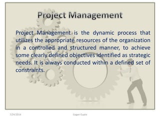 The document discusses various challenges that can occur in project management and provides recommendations to address them. It notes that project failure can result from going over budget and schedule, lower quality than expected, and stress on the team. Issues like scope creep, poor communication, inadequate resources, unclear requirements, unrealistic timelines, unplanned risks, undefined deliverables, and lack of formal project processes are identified as common causes of problems. The document recommends establishing clear plans, documentation, and controls for scope, schedule, communication, resources, risks, and deliverables to help manage projects successfully. Formal project management training is suggested for those who feel their projects are out of control.