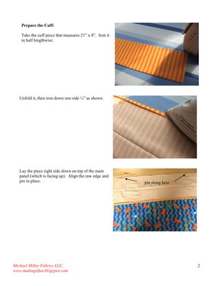 This document provides instructions for making a pillowcase with an inner flap using two coordinating fabrics. The main panel is made from a single piece of fabric that is at least 1.5 yards. It has cuffs sewn on each end, with one cuff having an inner flap. All seams are enclosed using a French seam to prevent raveling. Detailed steps are provided for cutting and sewing the pieces together to complete the pillowcase.