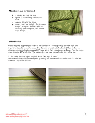 The document provides instructions for making tab top curtain panels with pieced fabric and a blackout lining. Key steps include piecing the curtain panel fabric to the desired size, finishing the raw edges, adding mitered corners, attaching tabs and a facing to the top of the panel, and inserting the blackout lining between the facing and pieced fabric to hide seams and protect from sun damage while providing a nice drape. The lining also has the added benefit of allowing children to sleep in longer by blocking outside light.