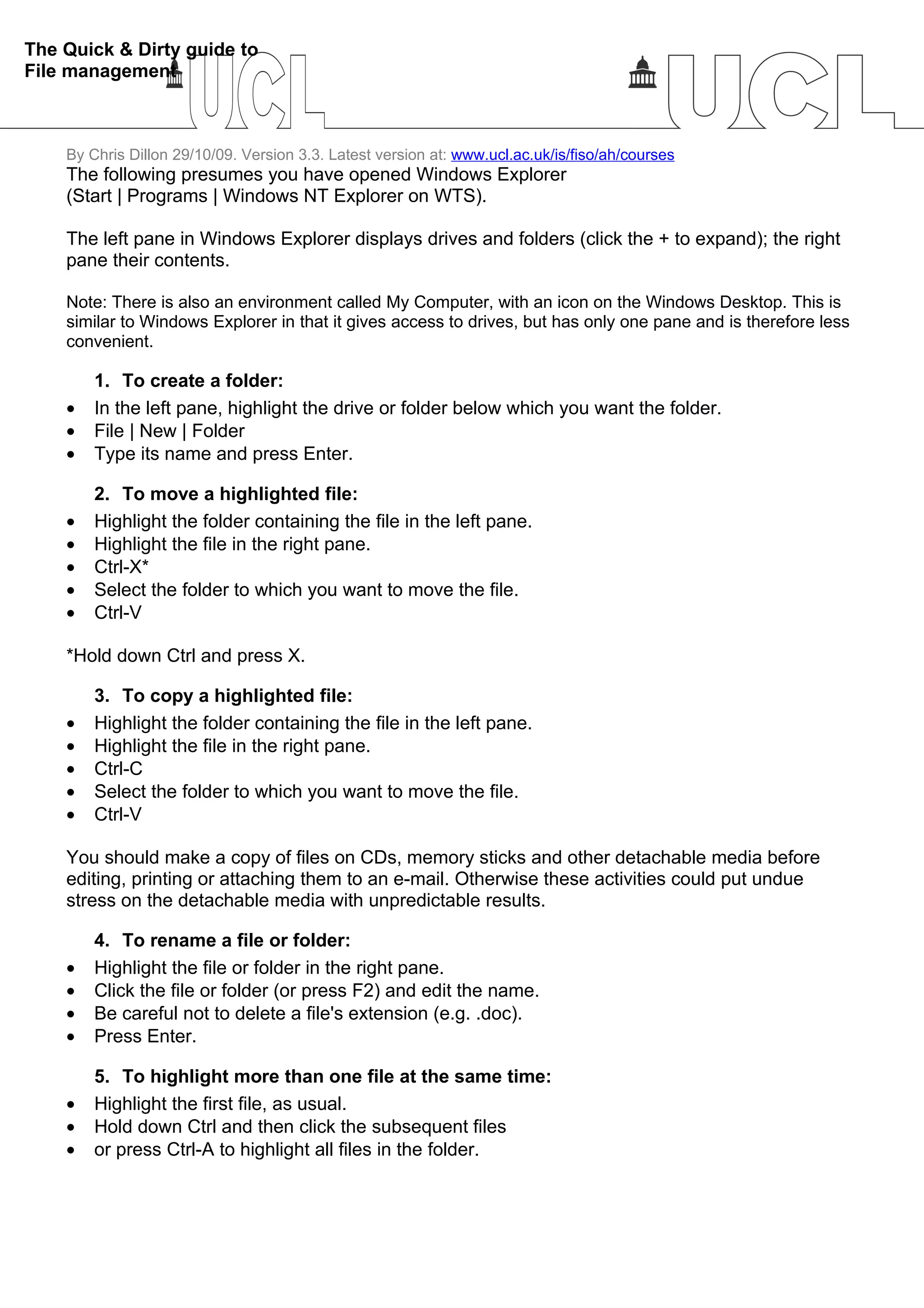 The document provides a quick guide to basic file management tasks in Windows Explorer, such as creating folders, moving and copying files between folders, renaming files and folders, finding files, creating and extracting zip files, and changing folder view settings. Key tasks covered include using Ctrl-X/C/V to cut/copy/paste files, Ctrl-clicking to select multiple files, and Ctrl-F to search by file name. Settings are also discussed for displaying file extensions and file details.