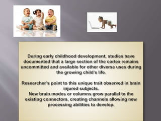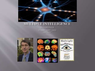 Gardner argues that traditional views of intelligence are too narrow and that there are multiple intelligences. He identifies eight criteria for what counts as an intelligence and lists eight intelligences: linguistic, logical-mathematical, spatial, bodily-kinesthetic, musical, interpersonal, intrapersonal, and naturalistic. Gardner acknowledges limitations of his theory and argues that intelligences are developed through biological and experiential factors within a cultural context. The document discusses applying multiple intelligences theory to education by incorporating varied forms of assessment beyond standardized testing.