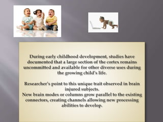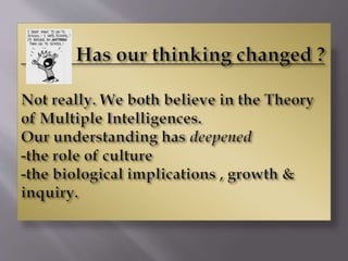 Gardner proposes that there are multiple intelligences rather than a single general intelligence. He identifies eight distinct intelligences: linguistic, logical-mathematical, spatial, bodily-kinesthetic, musical, interpersonal, intrapersonal, and naturalist. Gardner argues that assessments and education must account for and develop all of these intelligences to fully recognize human intellect. His theory aims to improve understanding of cognitive development across cultures and foster inquiry into supporting intelligences in various settings.