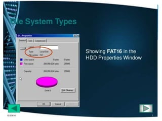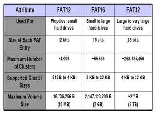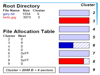 This document discusses disk operating systems and file systems. It defines a file as a named collection of related information stored on secondary storage. Files have attributes like name, size, type and location. The document describes file operations like creating, reading and deleting files. It explains different file types and structures. The document also discusses file allocation tables (FAT) which are used by operating systems to manage files and clusters on storage drives. It provides details on physical structures of floppy disks and hard disks, including system and data areas.