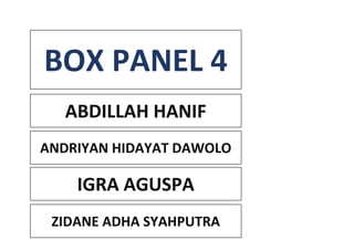 Dokumen ini mencakup beberapa nama, kemungkinan individu yang terlibat dalam suatu proyek atau kolaborasi. Terdapat empat panel yang berbeda, yang dapat merujuk pada bagian atau aspek yang beragam. Tidak ada informasi tambahan yang relevan atau konteks lebih lanjut yang disediakan.