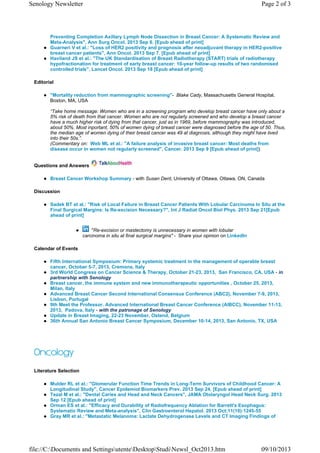 The newsletter provides information on senology apps for mobile devices, upcoming conferences, and recent publications in senology and oncology. It encourages connecting with other specialists on social media and shares summaries of workshops on breast cancer, melanoma, lung cancer, and stem cells. The editorial discusses findings that screening mammography reduces breast cancer mortality by about 5% while mortality is much higher for unscreened women diagnosed with breast cancer.