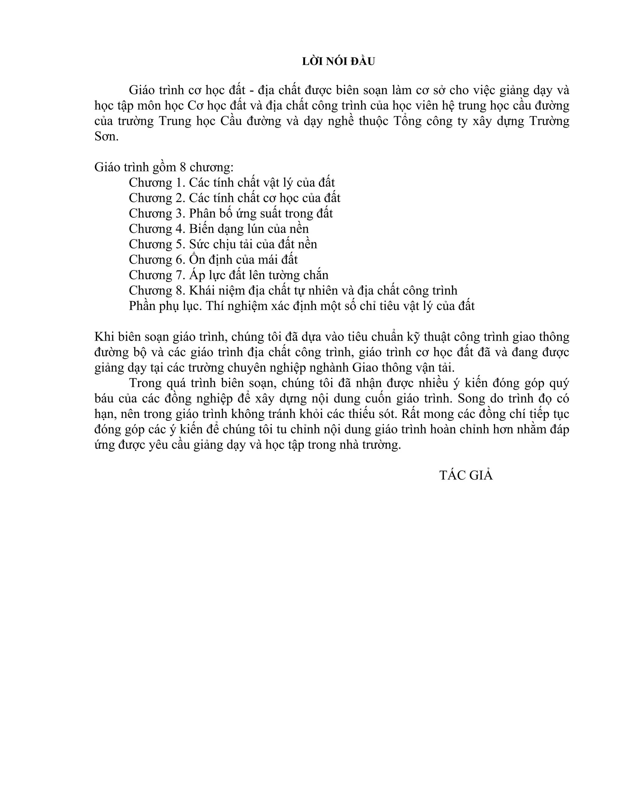 Giáo trình cơ học đất - địa chất cung cấp kiến thức cơ bản về tính chất vật lý và cơ học của đất, cùng với việc nghiên cứu các quy luật địa chất tự nhiên và ảnh hưởng của chúng đến công trình giao thông. Tài liệu được tổ chức thành 8 chương, bao gồm các chủ đề chữa tính chất đất, ứng suất, sức chịu tải, và ổn định của mái đất. Nội dung biên soạn dựa trên tiêu chuẩn kỹ thuật và ý kiến của đồng nghiệp, nhằm phục vụ giảng dạy và học tập hiệu quả.