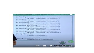 The document provides an overview of virtual functions in C++ and file handling in Perl, detailing both language features. It explains the syntax and functions for opening, reading, writing, and manipulating files in Perl, as well as Perl data types and looping constructs. Additionally, it includes examples of C++ virtual functions and various looping methods in Perl.