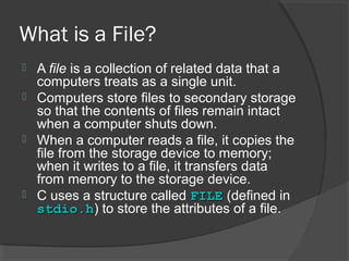 File handling in C allows programs to read from and write to files. A file contains related data treated as a single unit that is stored in secondary storage. C uses the FILE structure to represent an opened file and track attributes. The basic file operations are opening a file with fopen, reading/writing with fread/fwrite, seeking position with fseek, getting position with ftell, and closing with fclose. Files can be opened in different modes like read, write, append to specify how the file will be used.