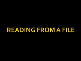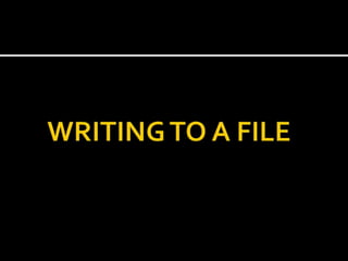 File handling in C programming uses file streams as the means of communication between programs and data files. The input stream extracts data from files and supplies it to the program, while the output stream stores data from the program into files. To handle file input/output, header file fstream.h is included, which contains ifstream and ofstream classes. Common file operations include opening, reading, writing, and closing files using functions like fopen(), fgetc(), fputs(), fclose(), and checking for end-of-file conditions. Files can be opened in different modes like read, write, append depending on the operation to be performed.