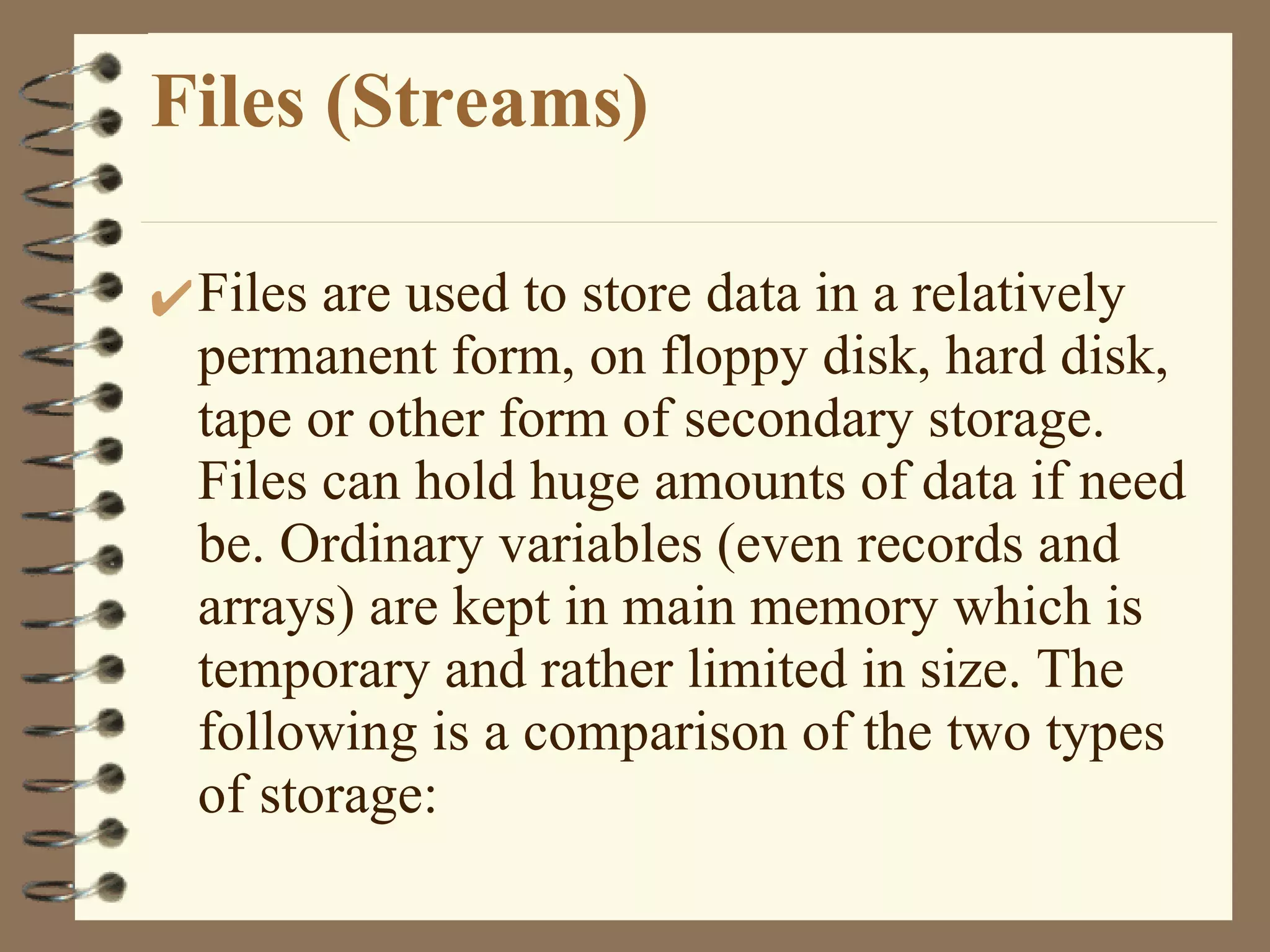 The document discusses file handling in C++. It explains that files are used to store data permanently on storage devices like hard disks, while variables are stored temporarily in memory. It then describes C++ streams and classes used for file input and output like ifstream, ofstream, and fstream. It also covers opening, closing, reading from and writing to files, as well as checking file pointers and seeking to different positions in a file.