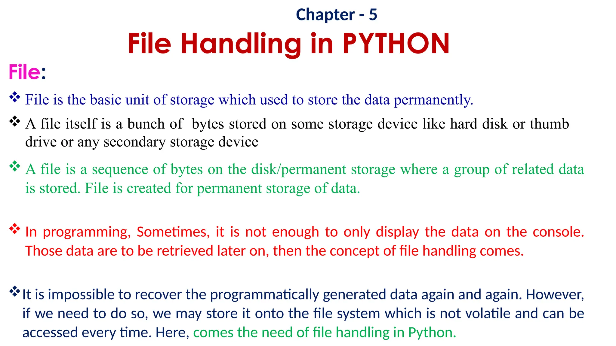 Those data are to be retrieved later on, then the concept of file handling comes.