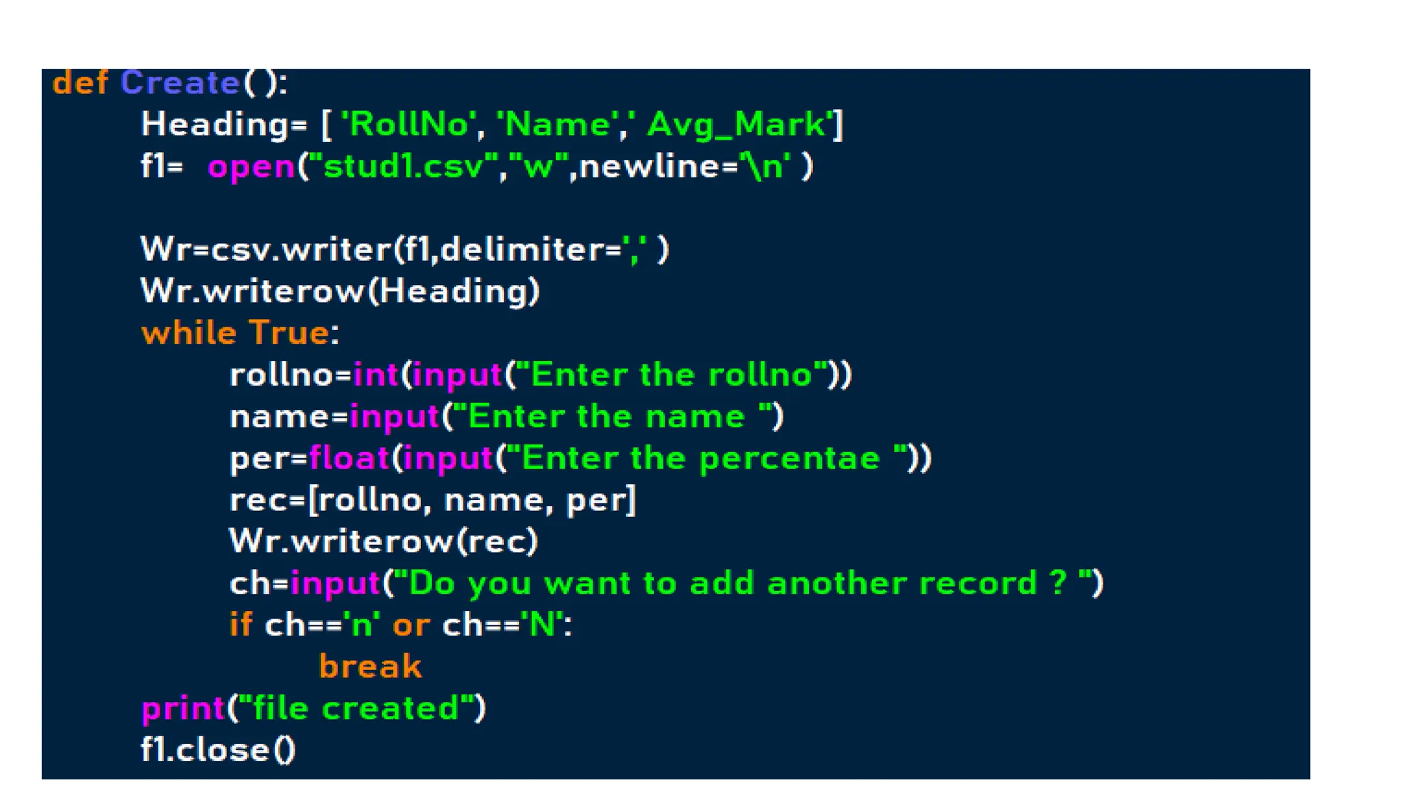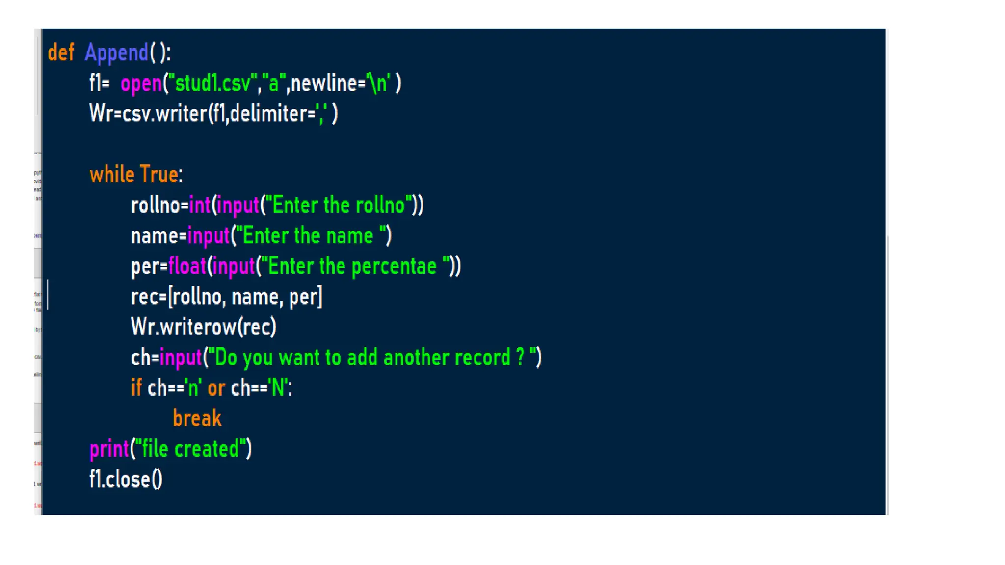 File-handle = open(“filename.csv”, “mode” [, newline=’n’])
